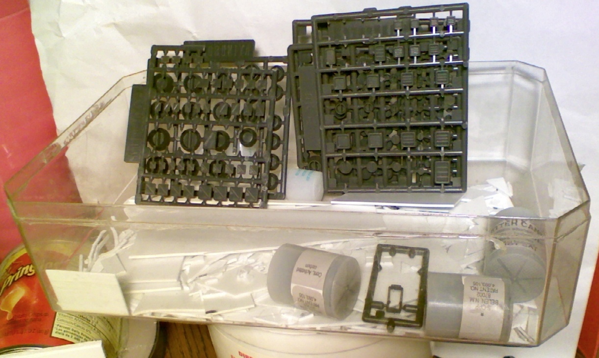I don't know about other peoples bits boxes, but mine is several separate boxes generally sorted by size closest to the table is the general catch-all which all the off-cuts from construction go. periodically I sort this box's contents by size, larger chunks of rod and card get cycled back to their respective boxes if they a larger than 2 inches in their gross dimensions. I have a separate box for sprued items, though I tend to prune said sprues back after they are used, with the resulting sprue lengths in to the off-cut box. The following picture is the catch-all, I use a clear plastic box so I can see what has drifted to the bottom at a glance.